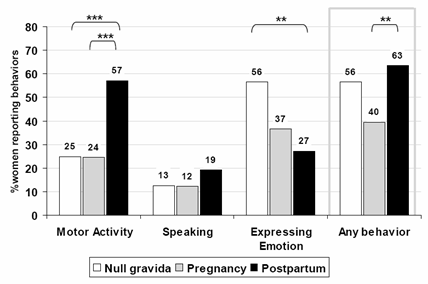 We recently discovered (Nielsen & Paquette, 2007) that as many as 63% of new mothers report some form of dream enactment in the first 12 postpartum weeks. We measured body and limb movements, emotional expression (e.g., weeping during a sad dream), and speaking out loud parts of what was spoken in the dream. Behaviors were also found for pregnant women (56%) and controls who had never had children (40%) (see Figure 1).