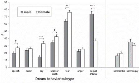 Prevalence of dream-enacting behaviours differs with gender (see Figure 3), being more prevalent for all types except sexual arousal dreams, and is independent of other parasomnias like nightmares and sleepwalking. The behaviors resemble those seen routinely in RBD but are much less frequent and severe. However, in some severe nightmares, the associated dream behaviours might be more extreme or cause injuries (see Obama’s nightmare cited earlier).